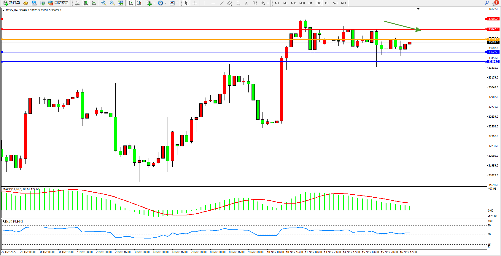 道琼斯指数11月16日(周三)收盘下跌38.96点,跌幅0.12%,报33553.96点;美国10月零售销售月率 1.3%,预期1.00%,为2022年2月以来最大增幅。美国10月份零售额大幅上升,显示经济强劲。尽管美联储采取了放缓经济增长的措施,但美国消费者的支出仍然很强。