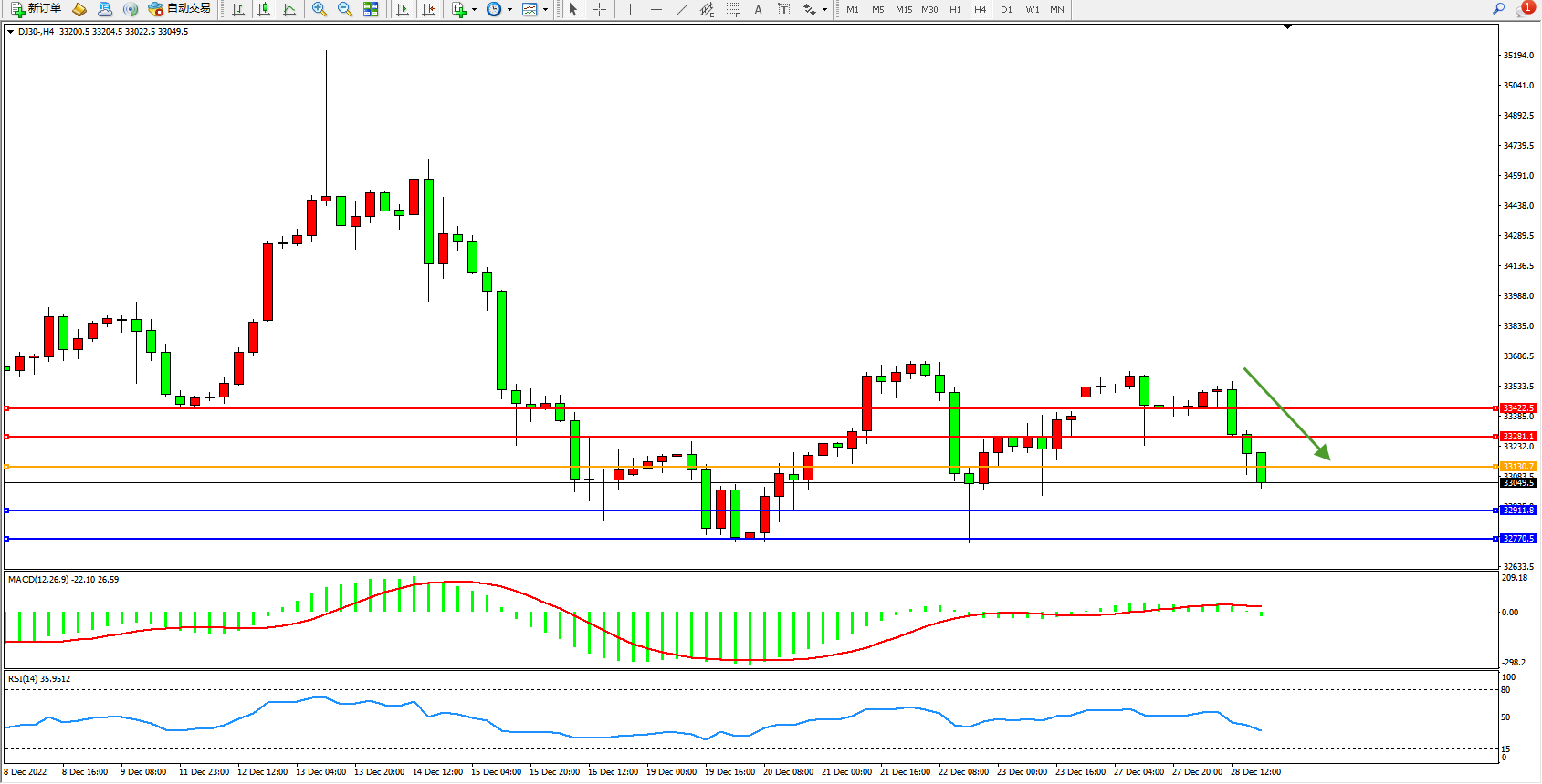 道琼斯指数DJ30——4小时K线图显示: