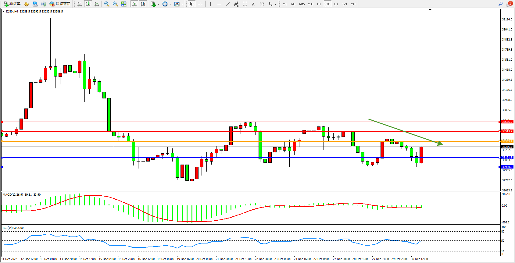道琼斯指数DJ30——4小时K线图显示: