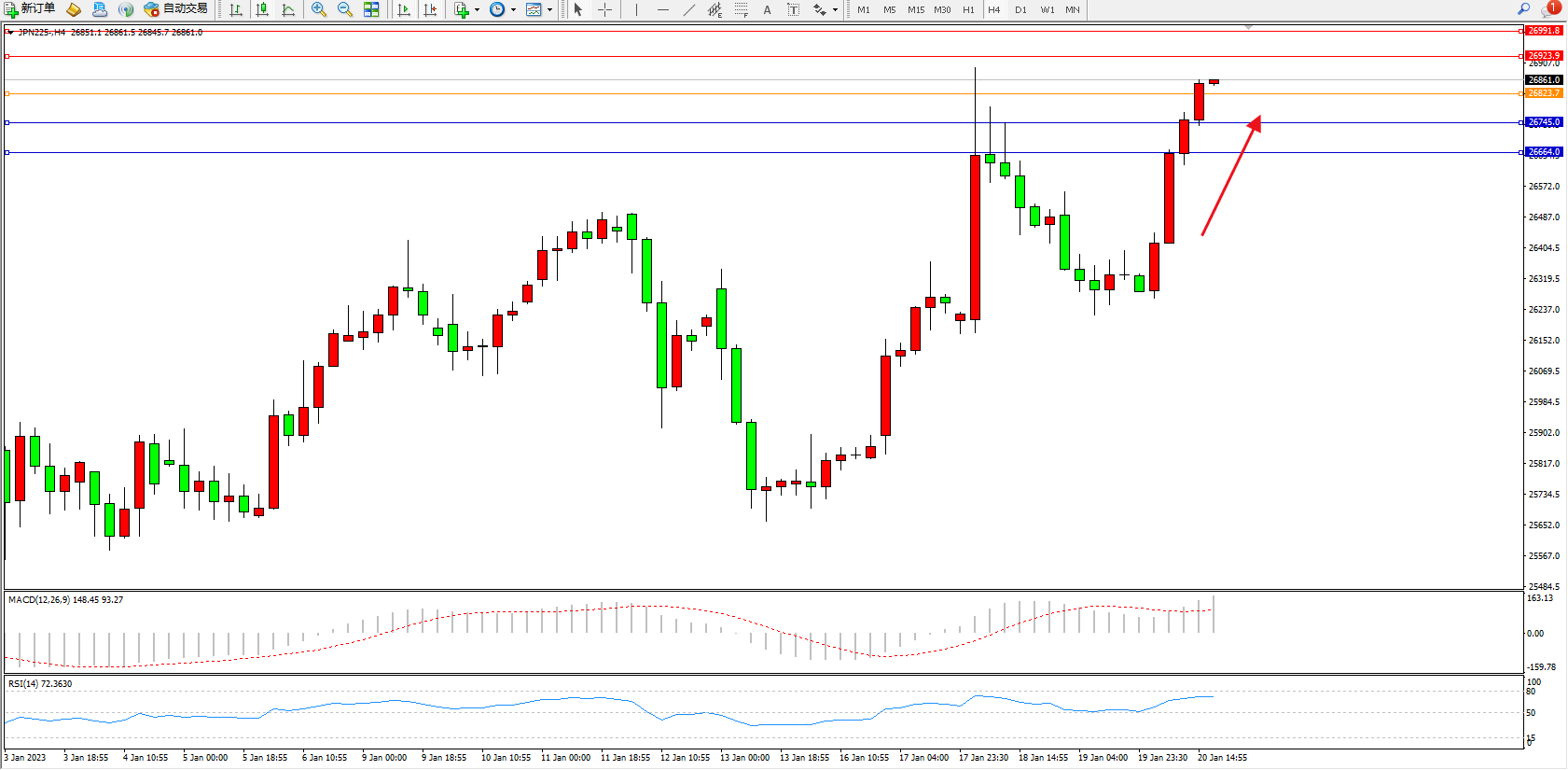 日经指数JPN225——4小时K线图显示: