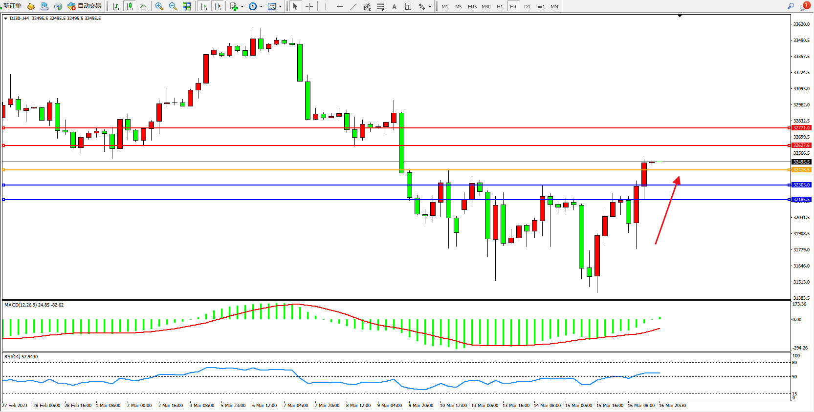 道琼斯指数DJ30——4小时K线图显示: