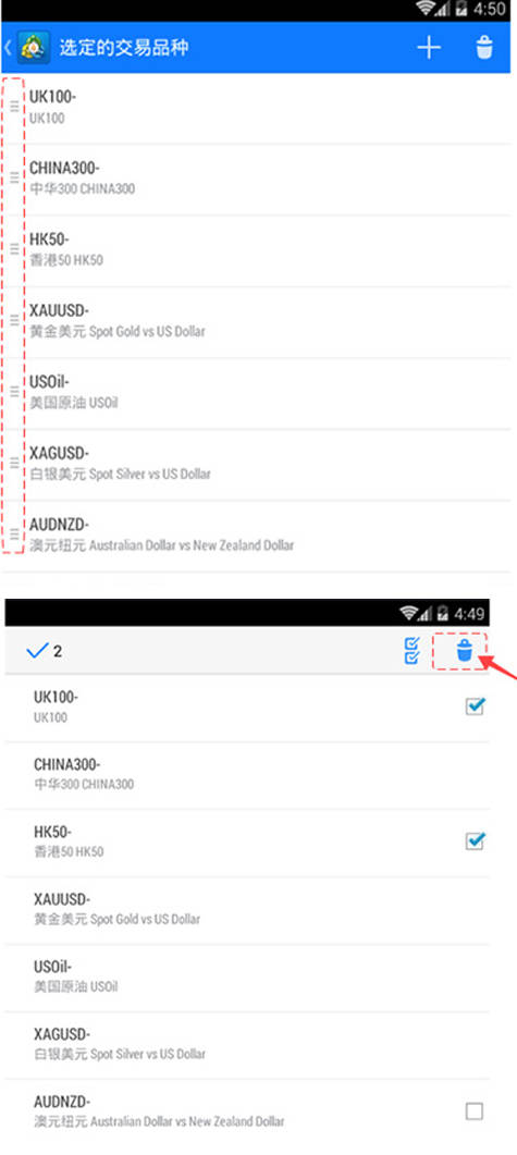 ●点击删除按钮,然后勾选商品后,点击右上角的删除按钮,删除商品。点击编辑按钮回到行情页面。