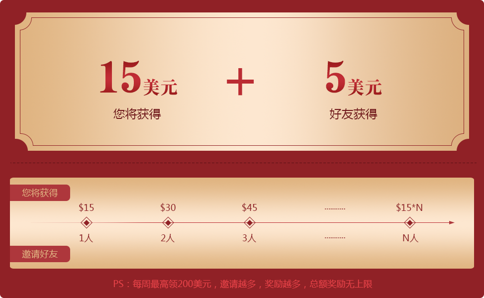 (2)邀请人每邀请一位用户开设激活汇富宝实盘交易账号,并且被邀请人交易满1标准手(可由任意交易品种累计)即可获得15美金奖励;